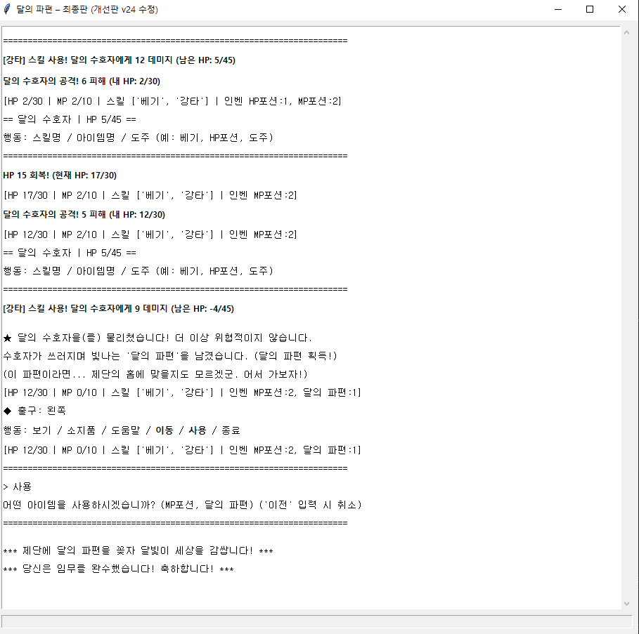 sprint("달의 파편 - 최종판 (개선판 v24 수정)") # 버전 업데이트