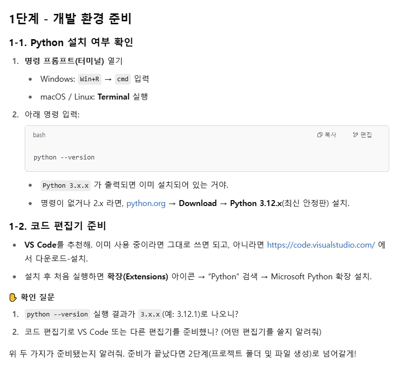 "나만의 Python 텍스트 기반 게임 만들기용 AI"를 만들기 위해 프롬프트 (명령어)를 짜야 했다.