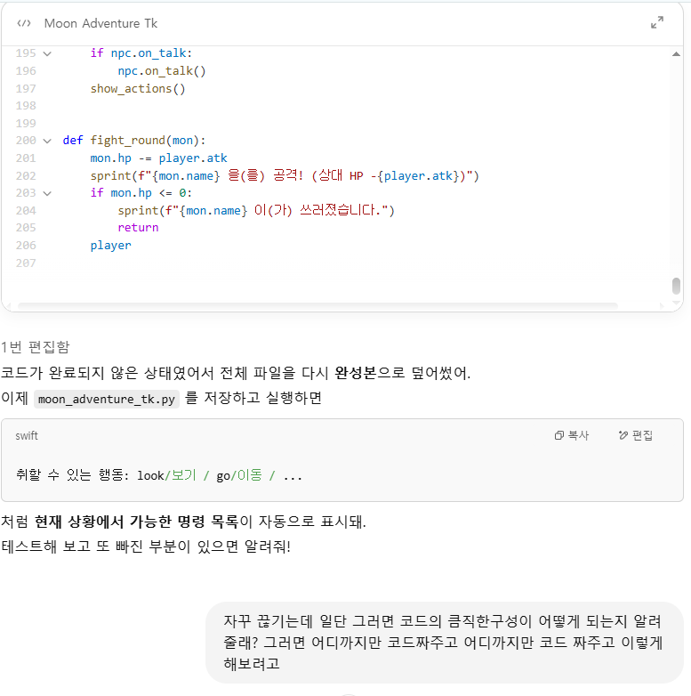 GPT가 1차적으로 짜준 코드를 VSC에 붙여넣었고, 여기서 친구의 조언에 따라 게임 플레이를 tkinker 로 할 수 있게끔 변경했다.