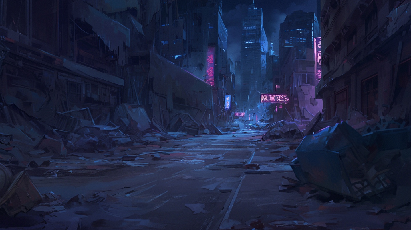 2D side-scrolling game concept art of a ruined futuristic city at night, broken skyscrapers in the background, flickering neon signs, cracked roads, scattered debris, mysterious robot enemies lurking in shadows, gritty atmosphere, dark color palette, moody lighting, cinematic composition, cel-shaded