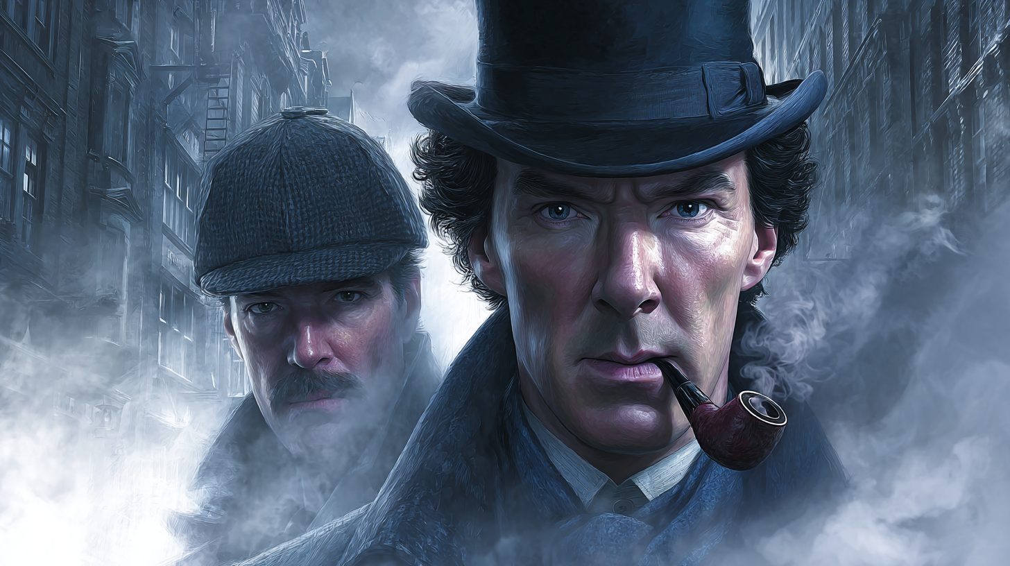 Sherlock Holmes and Dr. John Watson investigating a Victorian crime scene at night under gaslamp light, Sherlock wearing a bowler hat and tailored suit with a cigar in his mouth, Watson beside him in deerstalker cap and trench coat, both faces clearly visible and expressive, foggy cobblestone street, period-accurate details, moody cinematic atmosphere, photorealistic digital painting