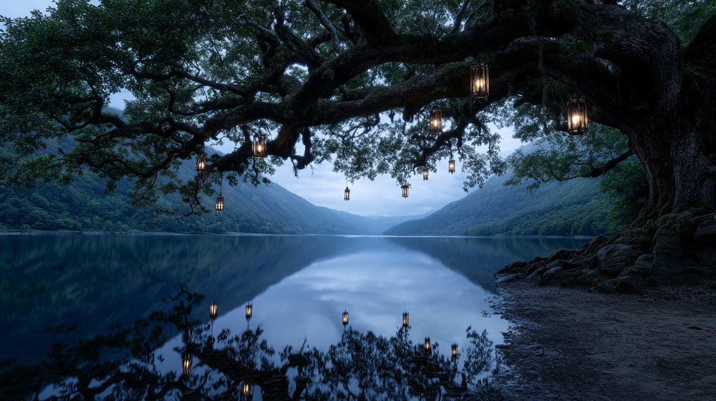 an ancient oak tree with glowing lanterns hanging from its roots, floating above a tranquil mountain lake, shot on 35mm f/1.2 lens, twilight blue hour, mirror reflection, atmospheric haze, ultra-detail
