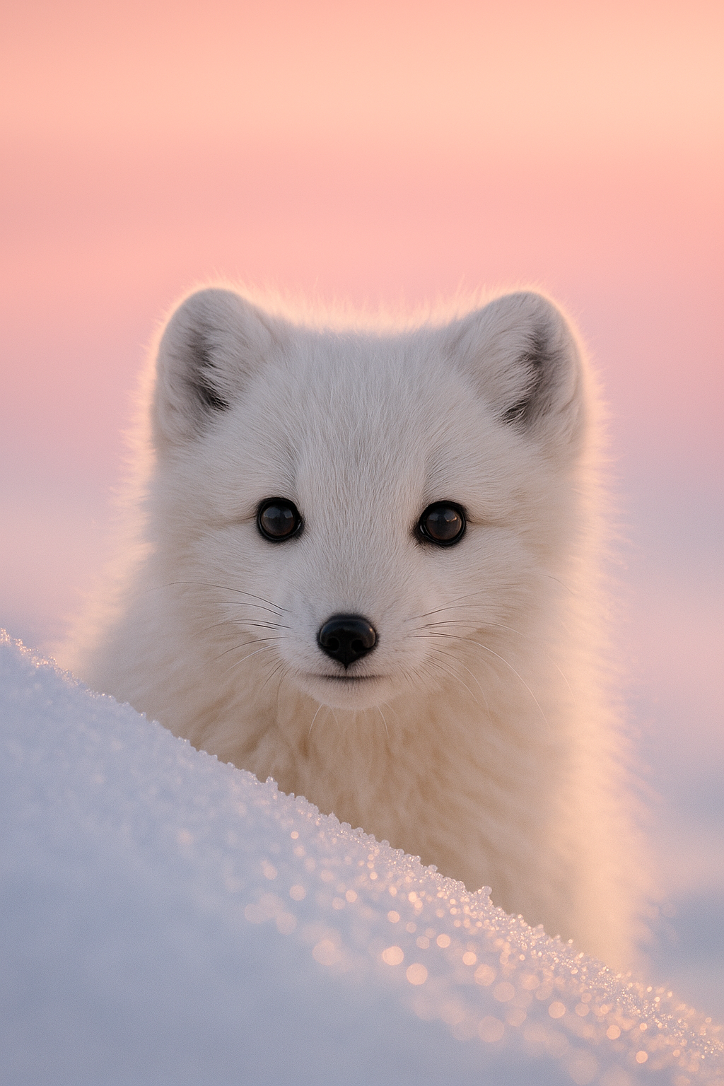 Fluffy arctic fox kit peeking out of a snowdrift at sunset, soft pink sky reflections, photographed on Sony α1 + FE 600 mm f/4 GM OSS, f/4, ISO 400, razor-sharp eyes, powdery snow crystals sparkling --ar 2:3 --style photo
