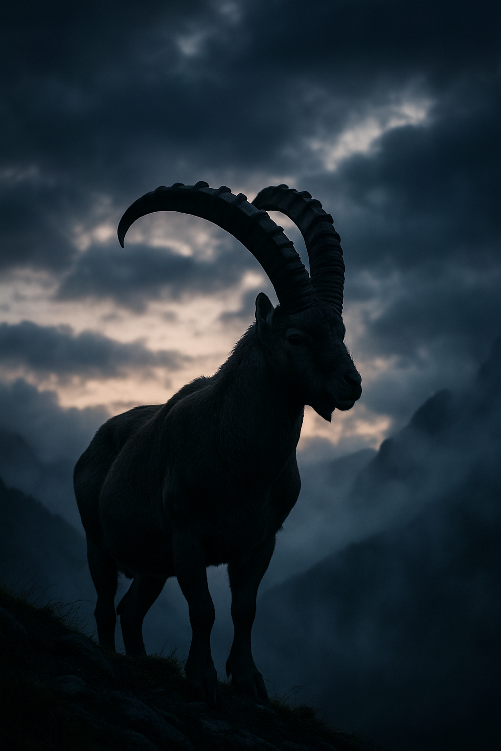 Majestic Alpine ibex standing on misty mountain ridge, cloudy dawn backdrop, photographed with Sony α1 + FE 400 mm f/2.8 GM OSS, f/2.8, ISO 640, dramatic high-contrast detail --ar 2:3 --style photo