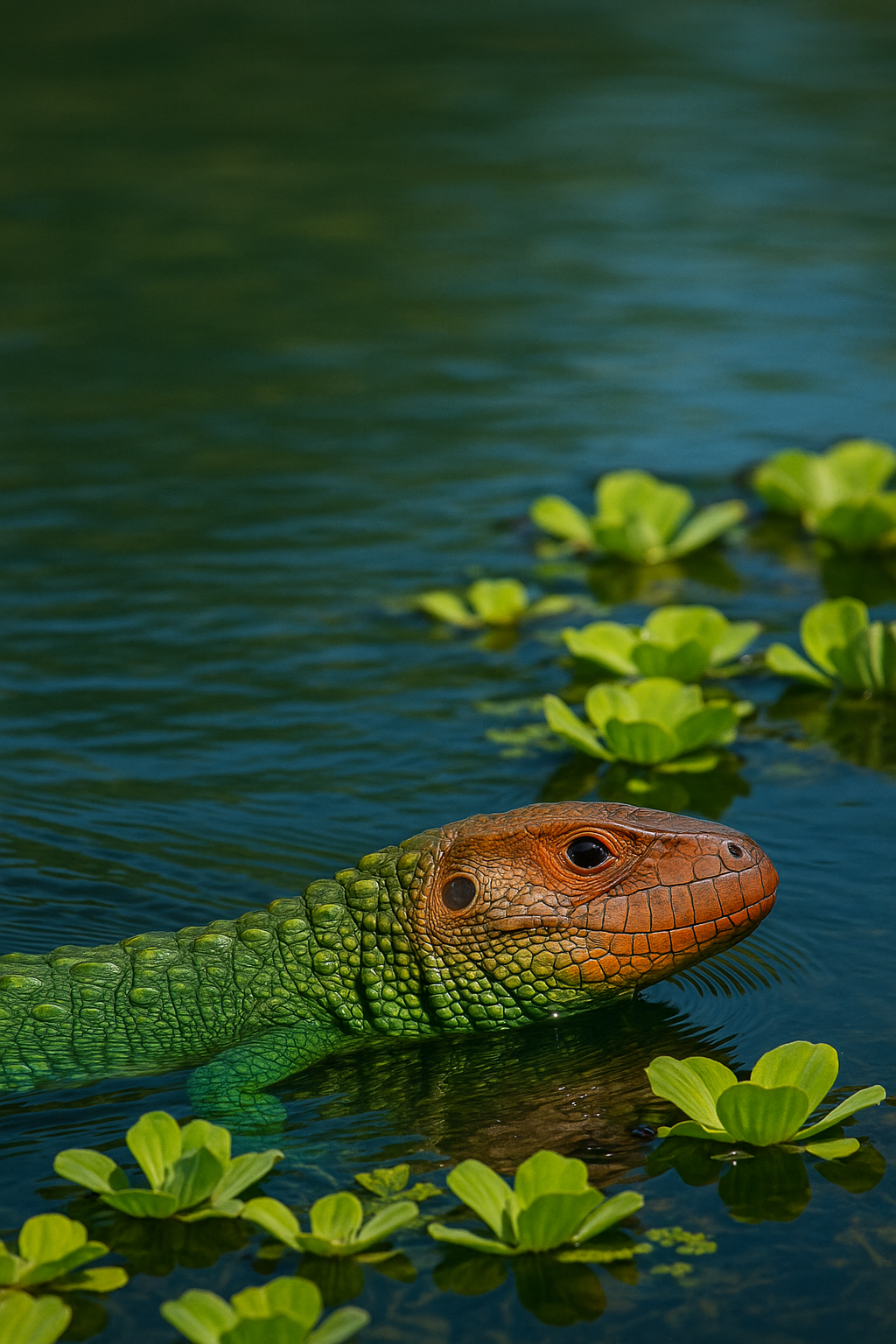 Caiman lizard gliding through clear Amazon backwater, floating aquatic plants, vibrant emerald scales, shot on Canon EOS R5 + RF 100-500 mm f/4.5-7.1 L IS USM at 500 mm, f/5.6, punchy colors, documentary realism --ar 3:2 --style photo