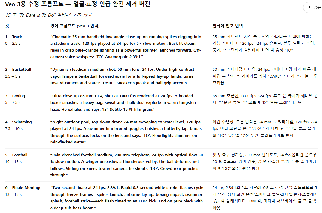 이렇게 완성된 프롬프트로 영상을 본격적으로 뽑아내려고 하였으나... 아직까지는 프롬프트 대로 완벽하게 나오려면 반복적으로 개선 프롬포트를 넣어줘야 하여, 이렇게 대화가 들어가고 동작이 구체적인 영상을 Pro 요금제 기준(한도가 적음)으로 만들기에는 한계가 있다고 생각하여 만들다가 말아버렸습니다.